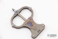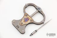 Brass and Titanium Toothpick Knuckle by Max Knives. The tooth pick can be screwed in in either direction. Comes with a velcro case. New from maker at the 2022 Blade Show West.