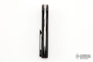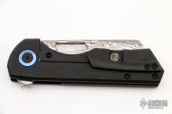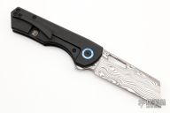 This Production Yeager by Brian Brown features a wharncliffe style Damasteel blade. The handle has a black PVD titanium frame with anodized titanium pivot collars, black PVD tip up clip and backspacer. Comes with a zippered case and COA. Excellent condition.