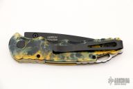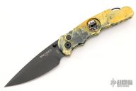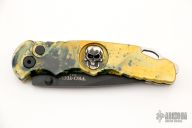 This TR-5 by Pro-Tech Knives features a black spear point blade with a single thumbstud. The handle has a PK Splash finished aluminum handle with Shaw skull inlay, stainless steel backspacer with lanyard hole, tip up blade stainless steel clip, features Matthew Lerch's Spring Assist. Comes with original sheath. This was a limited edition of 20, this one is #12. Includes the original box and papers.  Excellent condition.