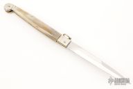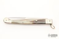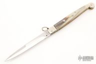 This Sicilian Ring Pull Stiletto from AGA Campolin features a mirror polished bayonet ground blade. The handle has a nickel silver bolsters and ring-pull with honey horn scales over brass liners and stainless steel backspacer. Dated 2013. Has some light scratches, otherwise excellent condition.