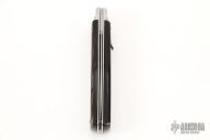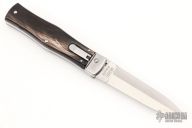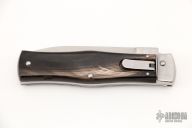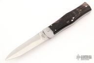 This lever auto from Mikov Knives has a mirror polished spear point blade with false top edge. The handle has polished stainless steel bolsters and liners, and buffalo horn scales, tip down stainless steel clip. Action is smooth and strong. Small chip is missing from the bottom of one scale otherwise the knife is in Excellent condition.