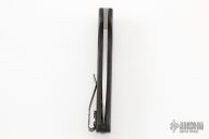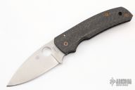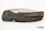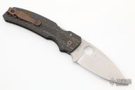 This Shaman by Spyderco features a tumble finished spear point blade with notched thumb and fingerrests, thumbhole. The handle has brass dust carbon fiber scales, inlaid stainless steel liners and a satin finished stainless steel backspacer, deep carry titanium clip, lanyard hole at the butt. Excellent condition.