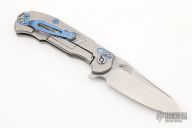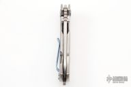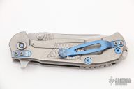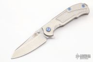This MP-1 by Rick Hinderer Knives features a stonewashed blade with notched thumbrest, dual thumbstuds and flipper. The full titanium handle is also stonewashed with a matching clip that can be positioned for tip up or down carry. Has blue anodized titanium screws. The MP-1 also features Hinderer's new HMBS (Hinderer Modular Back Spacer). Includes original inspection card and box. Nice detent, lock up and blade seating. Has some scratches, otherwise excellent condition.