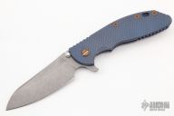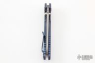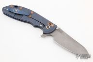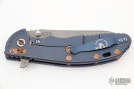 This Bowie Ground XM-24 from Hinderer Knives features a working finished blade with dual thumbstuds and notched thumbrest and flipper. The handle has a textured battle blue titanium frame over copper barrel spacers, hardware and filler tab and pocket clip, lockbar stabilizer.  Includes original box and extra hardware. Excellent condition.