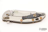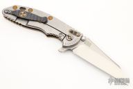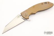 This 3.5" XM-18 from Hinderer Knives has a stonewashed finish wharncliffe blade with notched thumbrest and flipper. The handle has a bronzed textured titanium scale with a stonewashed titanium frame and flamed titanium pocket clip. Dual thumb studs and notched thumbrest, anodized titanium barrel spacer. Reversible pocket clip. Strong lock up and nice detent. Comes with original box and extra hardware. Excellent condition.
