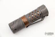 Blending cutting edge technology with elite craftsmanship, the Barrel M2JN TAD Edition combines collector grade fit and finish with a rugged build and staggering volume of light. Turned from solid Grade 5 titanium round bar, the M2JN TAD Edition features a rich sand blasted finish, offset by a copper beauty ring and matching inner sleeve. Our seamless laser etched topo pattern is overlaid onto the body of the light while our logo is etched onto the sandblasted titanium clip. Rings and sleeves can be swapped out, enabling you to update and customize your carry without changing your illumination platform. This compact single cell conservatively puts out over 1000 lumens on 'Turbo' mode, while 'Moon' mode will run for ten days on a single battery. Three high performance Cree XP-L HI 5K LEDs, nested into an aqua blue glow ring, deliver exceptional color rendition and night resolution. A solid copper pill enclosing the light engine helps dissipate heat and a protected microprocessor maximizes light output, resulting in a consistent level of light output throughout the battery’s life. All Barrell lights comes with a titanium stonewashed deep carry pocket clip and titanium screws for comfortable carry and superior strength. Visit https://www.barrelflashlights.com/pages/programming to take full advantage of all the features that the M2JN has to offer. From customization and disassembly to accessing the hidden programming mode, Barrel provides excellent tutorials for configuring and caring for your light. Comes with original box and COA. Excellent condition. H17F. Battery is IMR 16340 3.7V Li-Mn