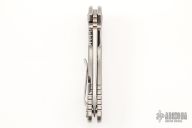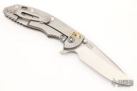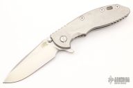 This 3.5" XM-18 from Hinderer Knives has a stonewashed finish S45VN blade with notched thumbrest and flipper. The handle has a stonewashed titanium frame and titanium pocket clip. Dual thumb studs and notched thumbrest, titanium barrel spacer. Reversible pocket clip. Strong lock up and nice detent. Comes with original box and extra hardware. Excellent condition.