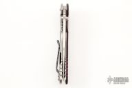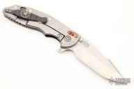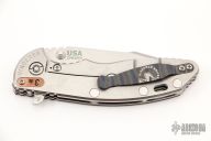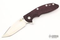 This XM-18 Skinny by Rick Hinderer features a stonewash finished blade with notched thumbrest and flipper. The handle has a custom burgundy canvas micarta front scale, stonewashed titanium frame, and a tip up or down reversible flamed titanium clip and copper filler tab, lanyard hole at the butt. Comes with original box and extra hardware. Excellent condition.