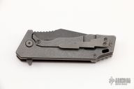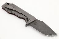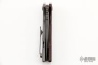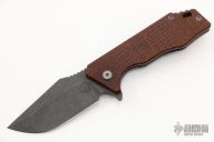 This Mini J-Cape from Something Obscene Company features a black tumbled blade with notched thumbramp and flipper tab. The handle is burlap micarta and tumbled titanium with matching titanium clip and backspacer. Comes with original box and COA. Excellent condition.