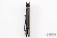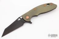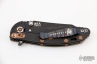 This XM-18 by Rick Hinderer features a battle black blade with notched thumbrest and flipper. The handle has an anodized titanium front scale and battle black frame, tip up or down reversible titanium clip and copper filler tab. Copper hardware. Excellent condition. Comes with original box and papers.
