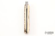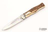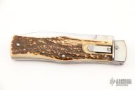 This lever auto from Mikov Knives has a mirror polished spear point blade with false top edge. The handle has polished stainless steel bolsters and liners, and stag scales. Action is smooth and strong. Has a few scratches, otherwise excellent condition.