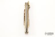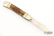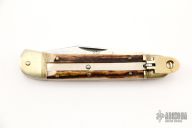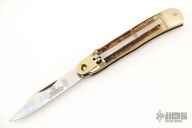 This leverlock auto by Hubertus features a mirror polished clip point blade, nickel silver double bolsters, stag scales, and brass liners and pins. Opens with a nice snap. Very fast opening. Has some light patina, otherwise excellent condition.