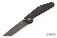 This Auto from GT Knives features a black coated tanto style blade. The handle is machined black anodized aluminum, no clip. Has a few scratches, otherwise good condition. Blade locks in both the open and closed position. Must depress the pivot button to open and close the knife.