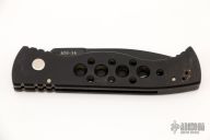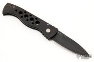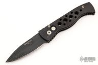 This is an old original TR-2 side opening auto with a black aluminum handle and black blade. It is missing the clip. Coil spring. This is a very early TR-2 from Pro-Tech. Has somes scuffs, otherwise good condition.