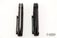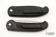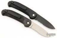 This Z-2000 by Hubertus features a clip point bead blasted partially serrated blade. The handle has a black plastic frame. This Z-2001 by Hubertus features a black partially serrated blade. The handle has a black plastic frame. Both have some scuffs and scratches, otherwise good user condition.