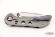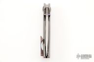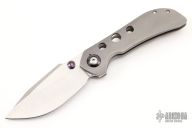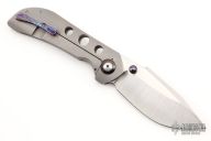 This Doptine by Steve Dumchus of Nova Blades features a satin finished blade with notched thumbrest and dual zircuti thumbstuds. The handle has a stonewashed titanium frame with floating zircuti backspacer and tip up clip with hidden screws. Nice detent, lockup and blade seating. Excellent condition. Comes with zippered case.