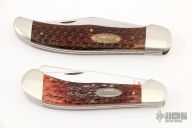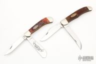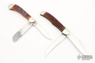 These Ka-Bar slipjoints are dated 1999 and 2002. Both have nickel silver bolsters, jigged bone scales, brass liners, and stainless steel springs. Both have a few light scratches and some patina, otherwise good condition for their age.