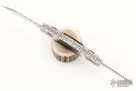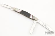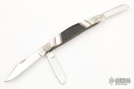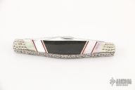 This Buck knife Customized by Painted Pony is a slipjoint with carved nickel silver bolsters and butt, gold web onyx covers with black lip pearl, nickel silver, mother-of-pearl and red spacers. 3 Mirror polished blades with fileworked spines. Includes original box and papers.  #54 of 250. Excellent condition.