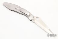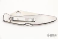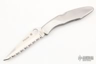 This Police Lockback from Spyderco has a satin finished clip point blade with full serrations and thumbhole. Handle is stainless steel with stainless steel back spacer (lock), and stainless steel tip down clip. Includes a padded zippered case. Light scratches are visible on the handle otherwise the knife is in excellent Condition.