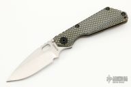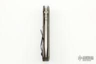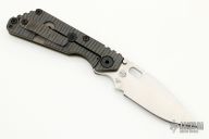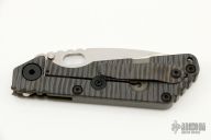This SNG framelock folder by Mick Strider features a stonewashed blade and a dimple pattern grip G-10 and flamed titanium frame and tip up titanium clip. Includes a "Lock Bar Stabilizer" for maximum reverse lock retention. Nice detent, lockup and blade seating. Has some scuffs, otherwise excellent condition.