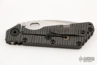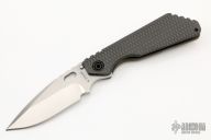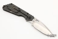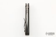 This SMF framelock folder by Mick Strider features a two-tone spear point blade and a dimple pattern grey aluminum and flamed titanium frame and tip up titanium clip. Includes a "Lock Bar Stabilizer" for maximum reverse lock retention. Nice detent, lockup and blade seating. Excellent condition.