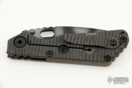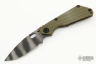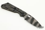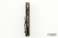 This SNG framelock folder by Mick Strider features a tiger stripe blade and a dimple pattern grip G-10 and flamed titanium frame and tip up titanium clip. Includes a "Lock Bar Stabilizer" for maximum reverse lock retention. Nice detent, lockup and blade seating. Has some scuffs, otherwise excellent condition.