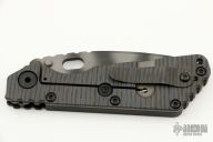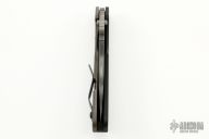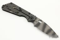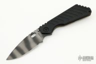 This Mick Strider SMF Fatty framelock folder features a tiger stripe blade with thumbhole and notched thumbrest. The handle has a black aluminum and flamed titanium frame with titanium clip, tip up custom deep carry pocket clip. Jimping on blade spine. Nice lockup, detent, and blade seating. Has a couple light scuffs, otherwise Excellent condition.