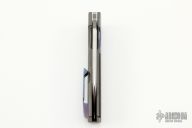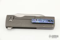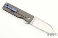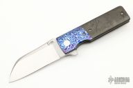 This Monster Grunt by David Clark features a satin finished sheepsfoot style blade with notched thumbrest and flipper. The handle has mokuti bolsters, marble carbon fiber scales, tumbled titanium liner and lockside with tip up mokuti clip and backspacer. Nice detent, lockup and blade seating. Comes with zippered case and COA. Excellent condition.