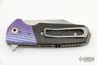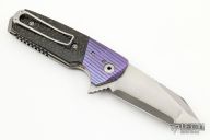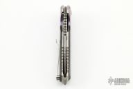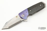 This Mini Tank Flipper from Allen Elishewitz features a San Mai Damascus blade with notched thumbrest and flipper. The handle is comprised of MokuTi bolsters, lightning strike carbon fiber scales, textured titanium liners, bead blasted stainless steel backspacer, stainless steel tip up pocket clip. Nice detent, lockup and blade seating. Includes a velcro case. Excellent condition.