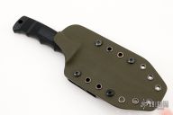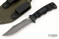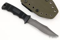 "Like its big brother, the SEAL Pup has a black coated blade, has notched thumbrest. Its lightweight, glass-reinforced Zytel handle features a raised diamond pattern for secure gripping in inclement weather." Comes with a custom green kydex sheath. Excellent condition.