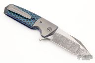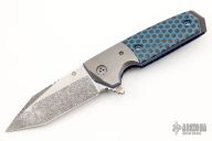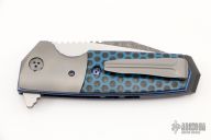 This Tank Flipper from Allen Elishewitz features a black snow finished blade with notched thumbrest and flipper. The handle is comprised of bead blasted titanium dovetailed bolsters, blue hex carbon fiber scales, textured and anodized titanium liners, zirconium backspacer, bead blasted titanium tip up pocket clip with hidden screws. Nice detent, lockup and blade seating. Includes a velcro case. Excellent condition.