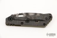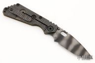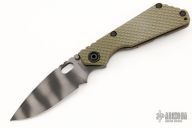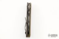 This SNG framelock folder by Mick Strider features a tiger stripe blade and a dimple pattern green G-10 and flamed titanium frame and tip up titanium clip. Includes a "Lock Bar Stabilizer" for maximum reverse lock retention. Nice detent, lockup and blade seating. Has a couple scuff, otherwise excellent condition.