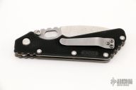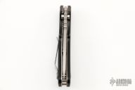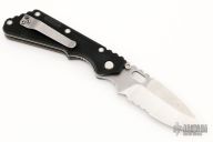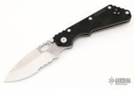 This is a Buck made Strider SNG with a partially serrated blade and black FRN scales, stainless steel liners, stainless steel tip up reversible carry clip. Notched thumbrest area and front/rear of handle provide a solid grip. Good lockup, detent and seating. Has some scratches and dings in the edge, otherwise good user condition.