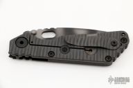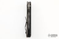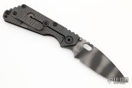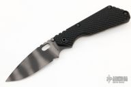 This SNG framelock folder by Mick Strider features a tiger stripe blade and a dimple pattern black G-10 and flamed titanium frame and tip up titanium clip. Includes a "Lock Bar Stabilizer" for maximum reverse lock retention. Nice detent, lockup and blade seating. Excellent Condition.