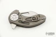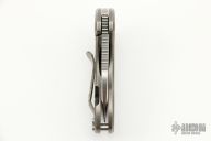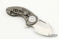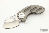 This Nano framelock flipper by Curtiss Knives features a stonewashed blade with notched thumbrest and flipper, and a thumbhole. The handle has a tumbled and milled titanium frame with cutouts and tip up clip. Stainless steel lock insert. Nice detent, lockup and blade seating. Rides on caged bearings. Excellent condition. Comes with a zippered case and COA.