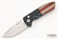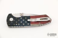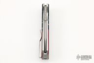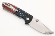 The Short Blade Rockeye features a compact design, with a 2.5″ blade that’s built for a multitude of cutting tasks. A pocket milled spine adds extra grip and depth to the design. The SBR features Peter Kellet's Vintage Flag anodized handles, satin hardware and deep carry clip, 2-tone blade with stonewashed bevels and machine satin flats, and gold lip pearl inlaid push button. Comes with original box and papers. Excellent condition.