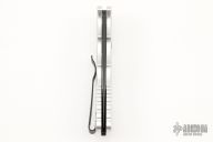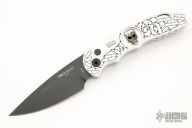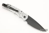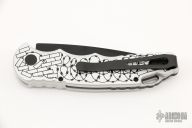 This TR-5 by Pro-Tech Knives features a black spear point blade. The handle has a silver aluminum handle with Shaw skull inlay, barbwire graphic, stainless steel backspacer with lanyard hole, tip up blade stainless steel clip.  Comes with original box and papers.  Excellent condition.