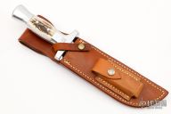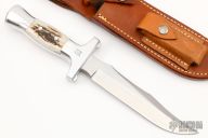 This Fighter by Ruana Knives features a satin finished blade with a sharpened top edge, .239" blade stock and 1.173" blade depth, hidden tang construction. The handle is cast from aluminum with elk inserts. Comes with brown leather sheath. Has some light scratches, otherwise excellent Condition.