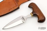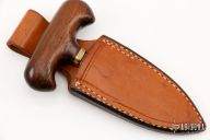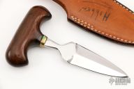 This push dagger by Gil Hibben features a polished double-edged blade and cocobolo handle with brass guard, .221" blade stock and 1.037" blade depth, hidden tang construction. Comes with a brown leather sheath. Has some light scratches, otherwise excellent condition.