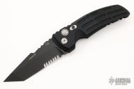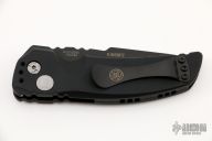 This EX-A01 by Hogue Knives is an Allen Elishewitz design, it features a black tanto partially serrated 154CM blade with notched thumbrest. The handle is black aluminum, tip up or down reversible black stainless steel clip. Has safety. Comes with Hogue box and papers. Excellent condition.
