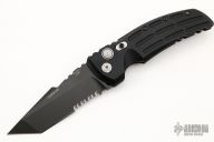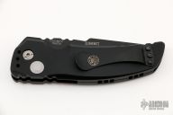 This EX-A01 by Hogue Knives is an Allen Elishewitz design, it features a black tanto partially serrated 154CM blade with notched thumbrest. The handle is black aluminum, tip up or down reversible black stainless steel clip. Has safety. Comes with Hogue box and papers. Excellent condition.