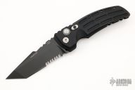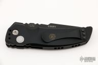 This EX-A01 by Hogue Knives is an Allen Elishewitz design, it features a black tanto partially serrated 154CM blade with notched thumbrest. The handle is black aluminum, tip up or down reversible black stainless steel clip. Has safety. Comes with Hogue box and papers. Excellent condition.