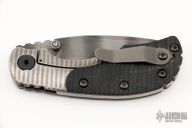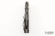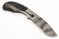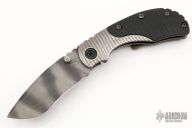 This TAD GEAR RCC framelock by Strider Knives features a recurve tiger striped blade with notched thumbrest and dual thumbstuds with tritium insets. The handle has a milled and blasted titanium frame with black G-10 scales, blasted titanium backspacer and a matchng tip up titanium clip. Nice detent and blade seating. Has some vertical blade play, some scuffs, otherwise good condition.