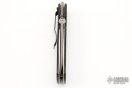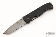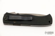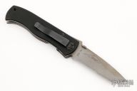 This 970S Emerson Designed CQC-7 by Benchmade features a bead blasted, chisel ground, drop point tanto style blade with swedge, thumb disc, notched thumb ramp and partial serrations. The handle is comprised of black G10 scales over titanium liners and black polymer backspacer. The black coated steel pocket clip is positioned for tip down carry. Lanyard hole in pommel. Some marks on handle and some patina on the blade but otherwise good condition. Blade itself looks unused, dispite the staining.