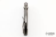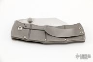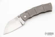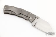 This Bamboo framelock folder by Michael Burch features a hand rub satin finished blade with dual thumbstuds and hamon. The handle has a titanium frame carved to look like bamboo, G10 backspacer, and a tip up titanium clip. Nice detent, lockup and blade seating. Has some scuffs, scratches, and light pitting. Good condition.