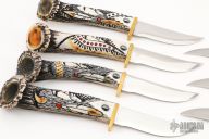 Cherokee Knife Maker, Ted Miller is an American Indian Artisan, of Miami-Peoria-Cherokee heritage. He has won over fifty significant awards. He carves images of his heritage and culture from stories passed down through his ancestors. Ted makes the handles for his knives from natural shed Deer and Elk Antler enhanced with semiprecious stones such as turquoise, coral, and onyx. Black handles are made from Buffalo horn. The blades for the knives are hand-shaped, sharpened, polished and heat-treated individually from 440C stainless steel, 56-60 Rockwell, and acid etched designs are worked on the larger blades . Stands shown are included in the price. All knives are shaped and balanced to provide a perfect grip for the sportsman as well as the ultimate in arts acquisition for the collector. Some handles may be similar in nature or design but each is an original piece with no two being exactly alike. Each knife is individually numbered and comes with a certificate of authenticity