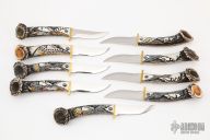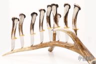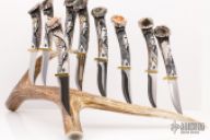 This Steak Knife Set of 9 Steak Knives by Ted Miller are very nicely made and displayed on a large antler. Comes with a COA. The knives are all mirror polished blades, carved stag handles with stone inlays and brass guards. Excellent condition.