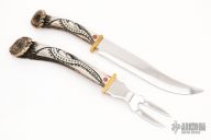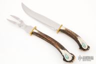This Council Set by Ted Miller features a carving knife with mirror polished blade, .142" blade stock and 1.505" blade depth, hidden tang construction. The handle has a brass guard and a carved stag grip with jasper and shiny black stones (can't remember what they are called). The carving knife has matching components. Comes with a nice stone and antler stand. Comes with COA. Excellent condition.