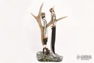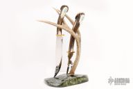 Cherokee Knife Maker, Ted Miller is an American Indian Artisan, of Miami-Peoria-Cherokee heritage. He has won over fifty significant awards. He carves images of his heritage and culture from stories passed down through his ancestors. Ted makes the handles for his knives from natural shed Deer and Elk Antler enhanced with semiprecious stones such as turquoise, coral, and onyx. Black handles are made from Buffalo horn. The blades for the knives are hand-shaped, sharpened, polished and heat-treated individually from 440C stainless steel, 56-60 Rockwell, and acid etched designs are worked on the larger blades . Stands shown are included in the price. All knives are shaped and balanced to provide a perfect grip for the sportsman as well as the ultimate in arts acquisition for the collector. Some handles may be similar in nature or design but each is an original piece with no two being exactly alike. Each knife is individually numbered and comes with a certificate of authenticity