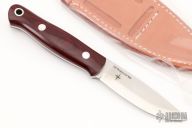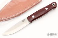 This Bushcrafter LT from Bark River Knives features a satin finish blade with a scandi grind, .129" blade stock and 1.015" blade depth full tang construction. The handle has burgundy canvas micarta scales. Includes leather sheath and original box. Excellent condition.